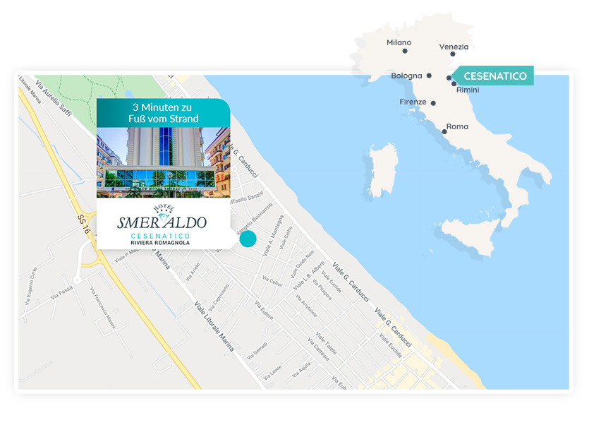 Navigieren Sie die Karte und finden Sie die genaue Lage unseres 4-Sterne Hotel in Cesenatico!